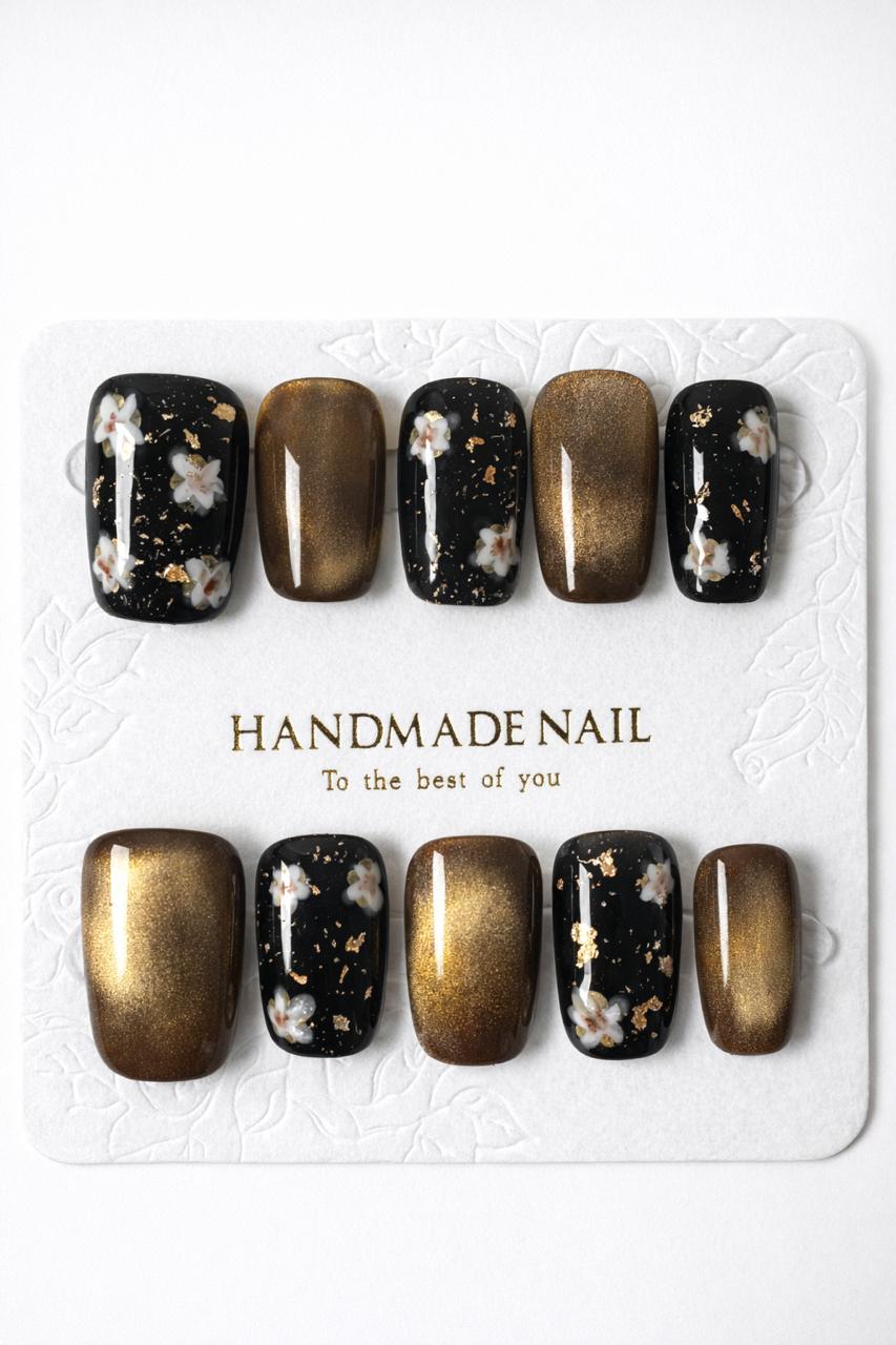 Plongez dans l'élégance absolue avec notre ensemble "Midnight Bloom". Ce design sophistiqué marie un noir profond orné de délicates fleurs blanches et d'éclats de feuilles d'or à un effet "cat-eye" doré ultra-dimensionnel. Parfaits pour une soirée chic ou pour ajouter une touche de luxe à votre quotidien, ces ongles offrent un fini velouté et précieux qui attire tous les regards.