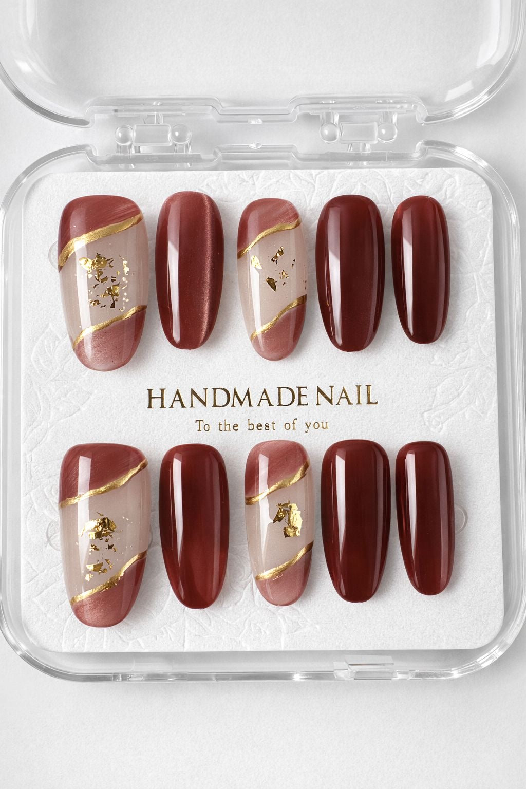 La puissance du bordeaux rencontre l'éclat de l'or. Avec sa forme amande élégante et ses détails dorés en relief, cet ensemble incarne le prestige. L'effet magnétique apporte une profondeur unique à ce rouge profond et intemporel.
