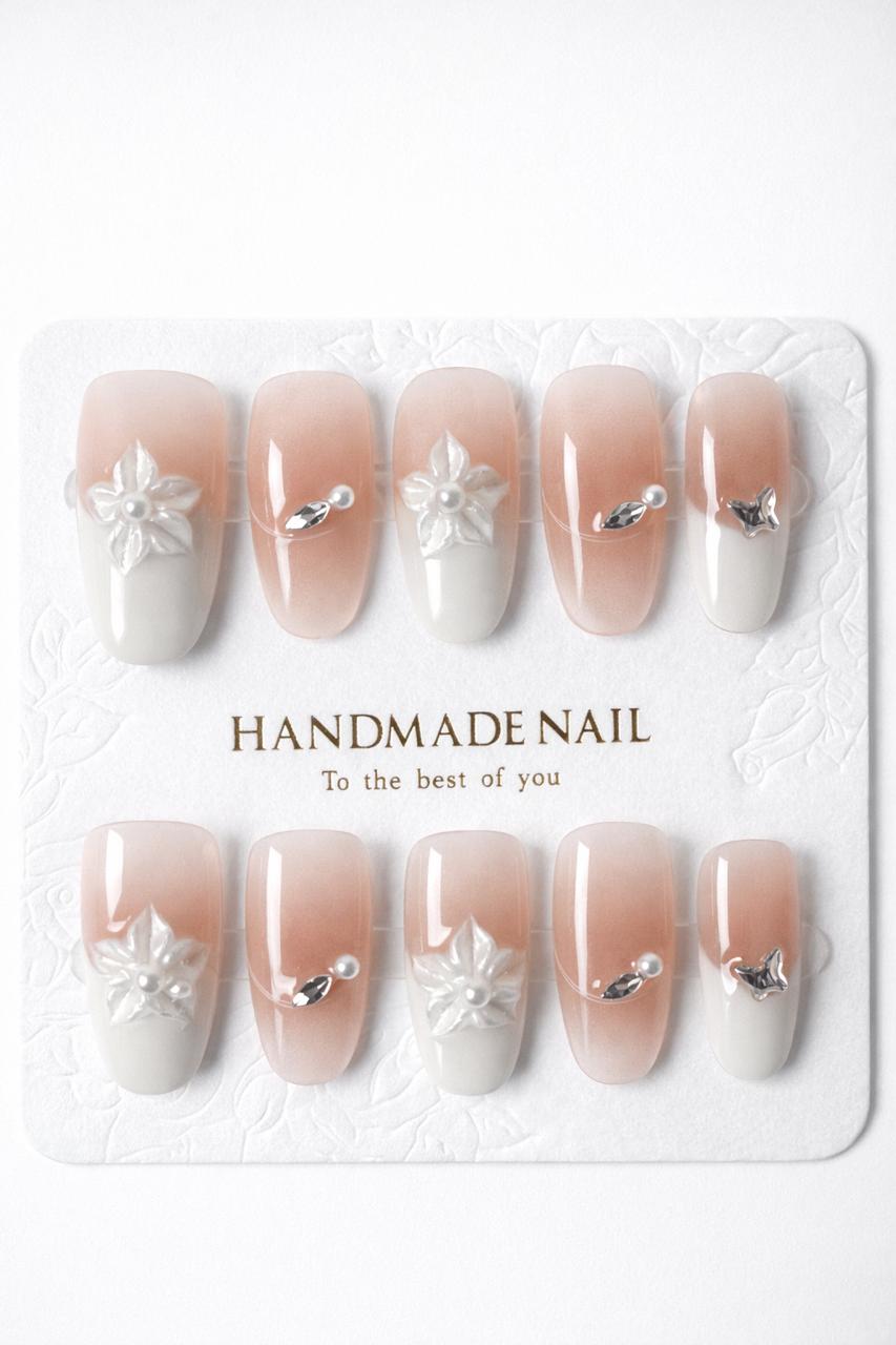 Sublimez vos mains avec le set Pearl Glaze, l'incarnation de la manucure "clean girl". Ce design présente un dégradé nude délicat vers une French blanche laiteuse, agrémenté de fleurs perlées en relief 3D et de cristaux scintillants. Un style pur, lumineux et ultra-raffiné pour une élégance sans effort.